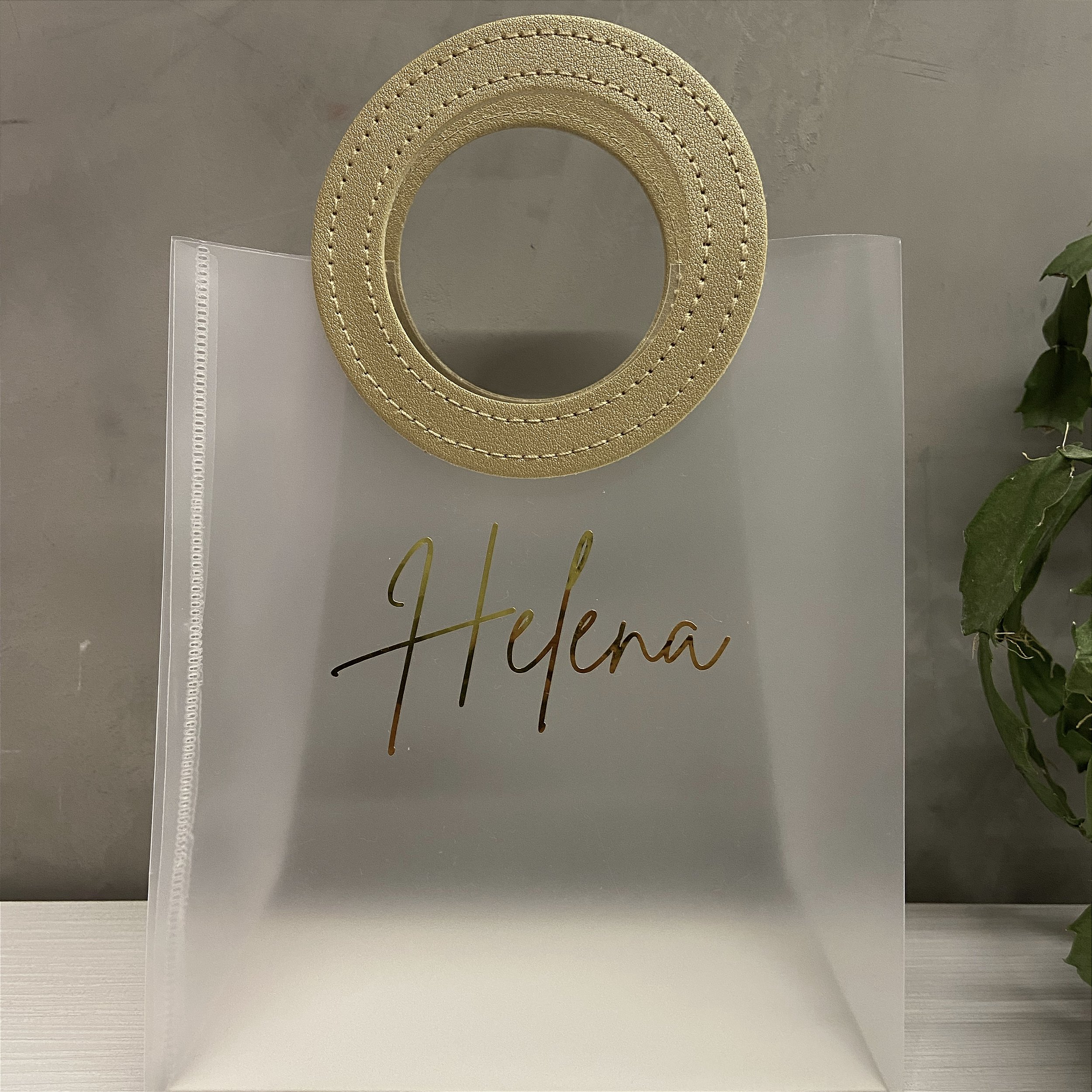 Bag tamanho médio transparente fosca com alça circular em couro sintético DOURADO.